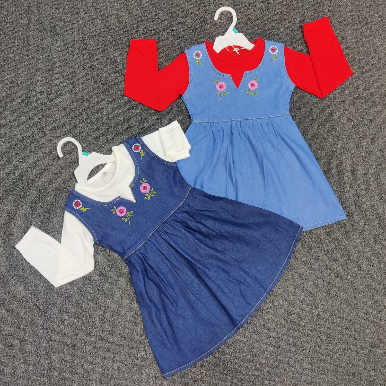 Dress your little one in style with this adorable Girls’ Denim Pinafore Dress Set, a perfect blend of comfort and cuteness! Each set includes a soft, long-sleeved inner top and a sleeveless denim pinafore featuring beautiful floral embroidery. Designed for everyday wear or special outings, this outfit offers both charm and practicality.
